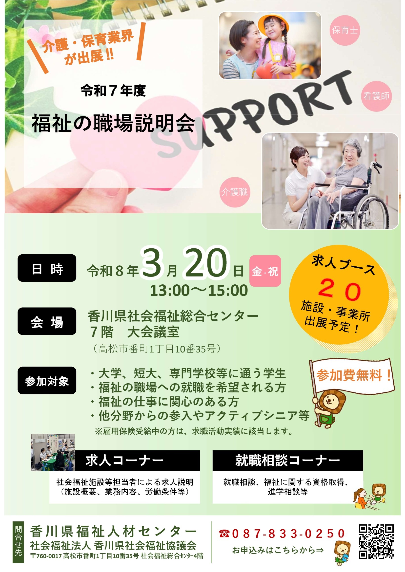香川県福祉人材センターによる就職相談、社会福祉に関する資格取得・進学相談等を実施